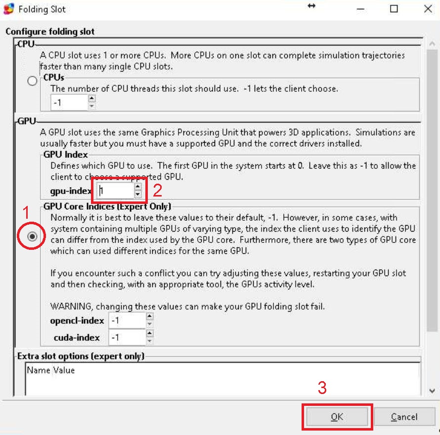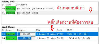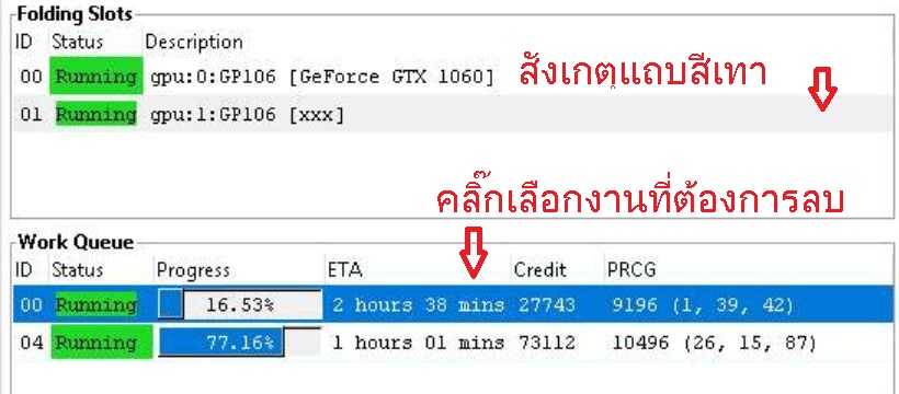 - ตรวจสอบว่างานที่ต้องการลบใช้ GPU ตัวไหน โดยคลิ๊กที่งาน ให้สังเกตุแถบสีเทาในกรอบ Folding Slots ให้จำ ID ของ GPU ที่อยู่ในแถบสีเท่า