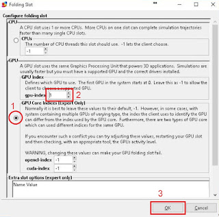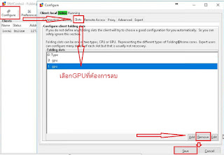 - ต่อไปให้ทำการเพิ่ม GPU เข้าไปใหม่โดยเข้าไปที่ Configure --> Slots คลิ๊ก Add จากนั้นคลิ๊กเลือก GPU ตรงช่อง gpu-index ให้ใส่ค่า GPU ID ที่เราเพิ่งลบออกไป เสร็จแล้วคลิ๊ก OK คลิ๊ก Save จะพบว่า GPU ได้ถูกเพิ่มเข้ามาพร้อมกับร้องของานใหม่